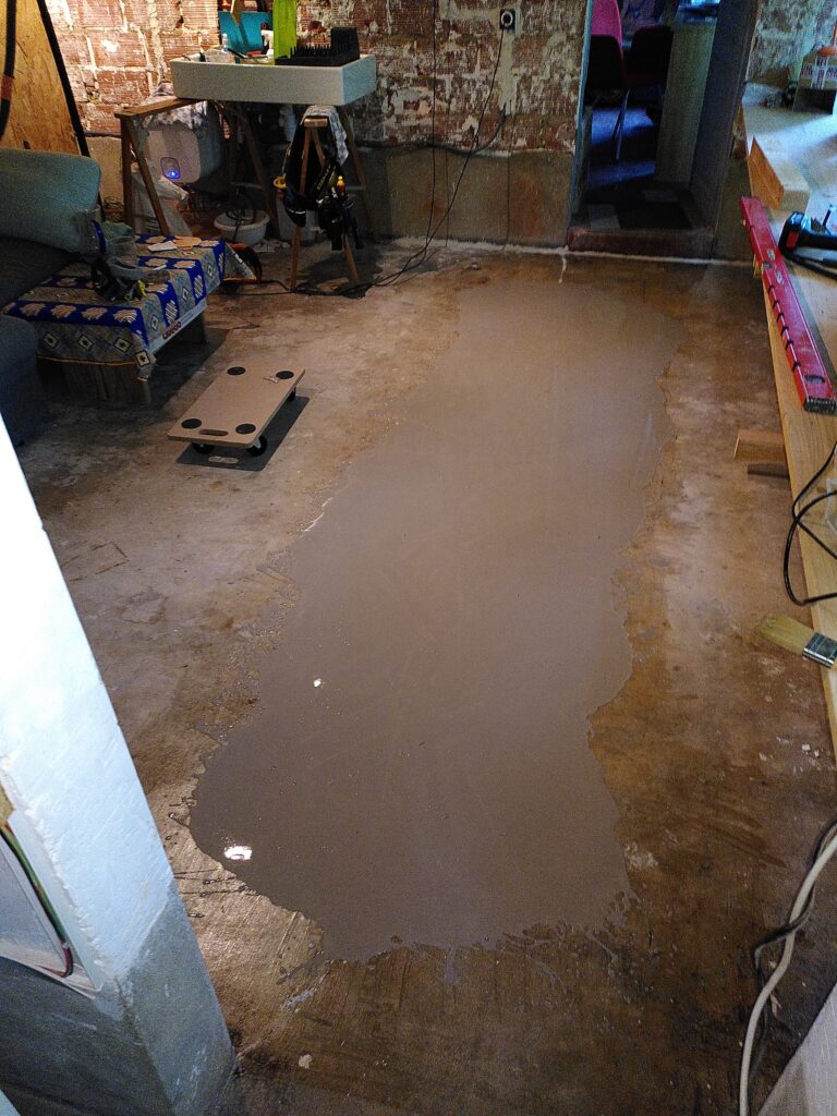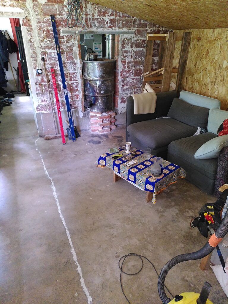 On observant la non planéité du sol et pour éviter que l’OSB travaille trop et s’use, j’ai dû faire un ragréage. N’ayant pas le courage de le faire sur toute la pièce et de gros doutes sur la hauteur du sol je n’ai fait que le couloir qui semblait être le moins régulier.