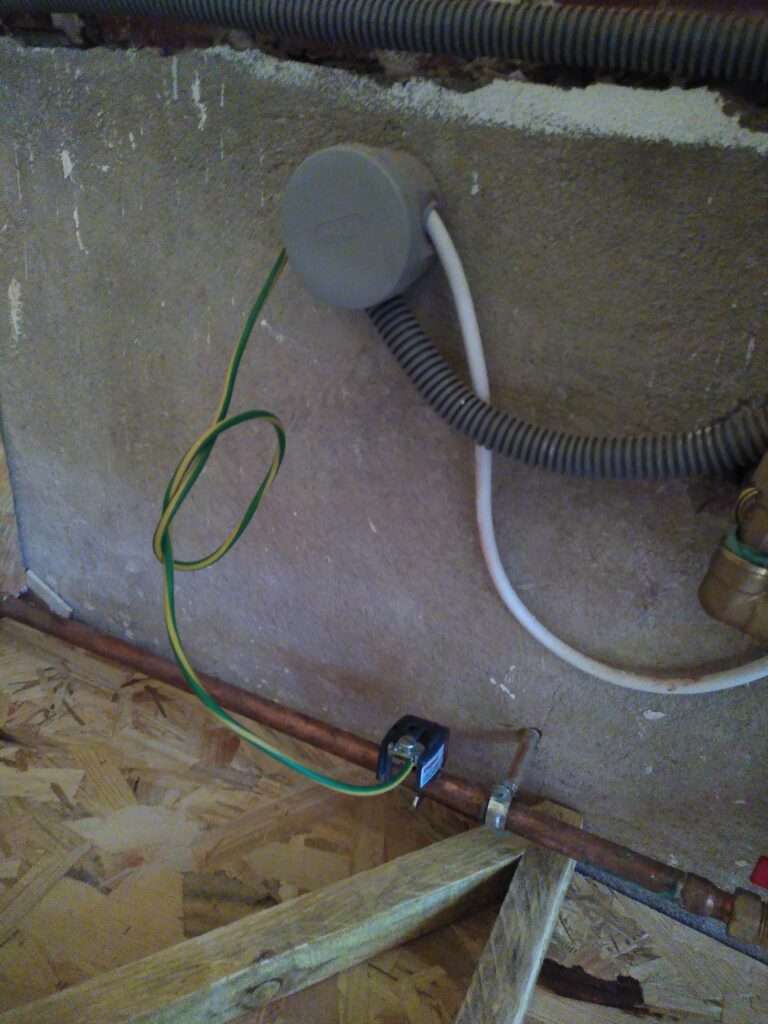 C’est un câble de terre (dans mon cas de 6 mm²) qui relie le cuivre du circuit d’eau au bornier de terre du tableau électrique. Permettant en cas de contact électrique avec le conduit, de protéger les personnes si elle même sont en contact avec le cuivre électrisé.